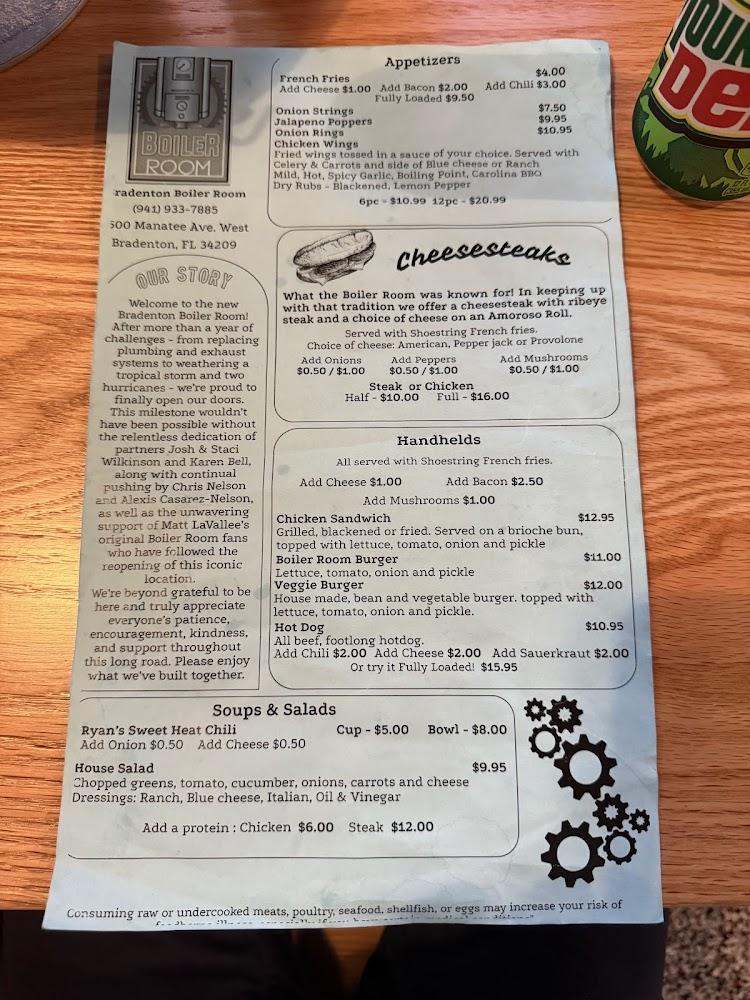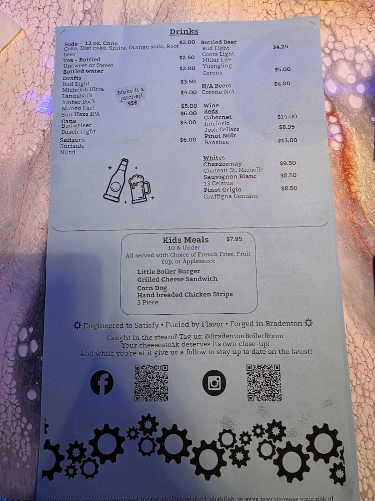 The diverse drinks menu includes local beers and affordable options, perfect for pairing with meals. Whether it's a family outing or a casual games night, The Boiler Room’s menu provides something to satisfy every craving.